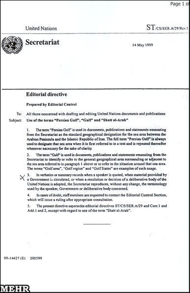 خبرگزاری مهر: به رغم تلاش ناکام برخی کشورهای منطقه و معدودی از دول و رسانه های غربی در استفاده از واژه هایی مجعول نظیر خلیج "ع ر ب ی"و تلاش آنها برای تملک جزایر سه گانه، اسناد رسمی سازمان ملل حکایت از آن دارد که این سازمان در نامه ای رسمی از همه کشورها خواسته تا در هر موردی از نام استاندارد "خلیج فارس" استفاده کنند.