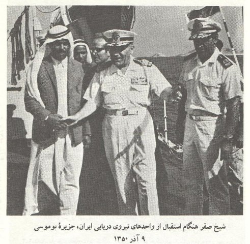 شیخ صفر برادر شیخ شارجه از نیروهای ایرانی در هنگام باز پس گیری جزیره بوموسا