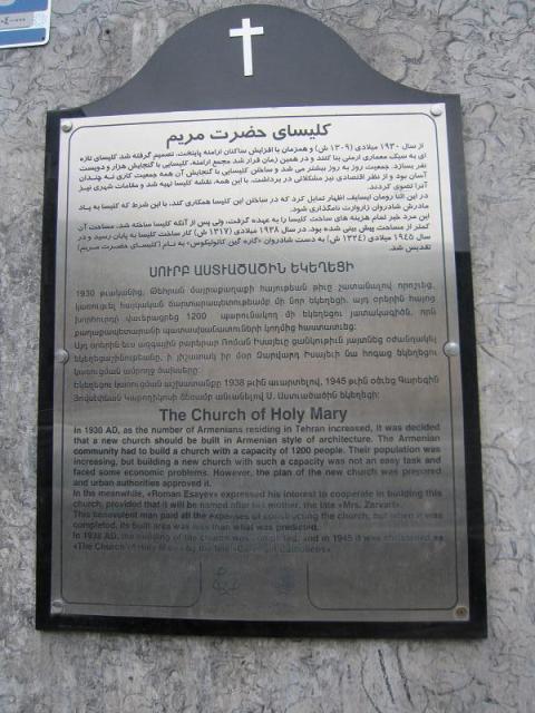 کلیسای مریم مقدس تهران در سال ۱۳۲۴ ه.ش (۱۹۴۵م) با هزینه شخصی فردی خیر بنام رومان عیسی یان بنا گردیده و معمار آن نیکلای مارکف بوده است، این بنا در سال ۱۳۸۱ به ثبت آثار ملی ایران رسیدهاست. این بنا بین سالهای ۱۳۲۴ تا ۱۳۴۹ دفتر اصلی و محل سکونت اسقف اعظم ارامنه بوده است که بعدها به کلیسای سرکیس مقدس انتقال یافت.