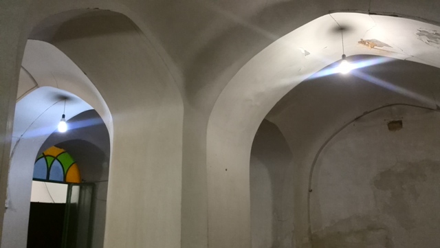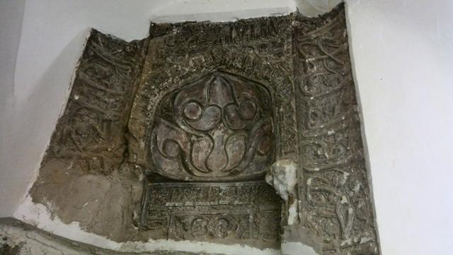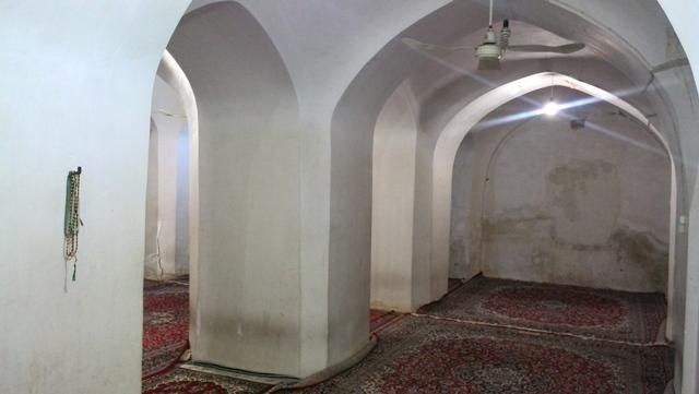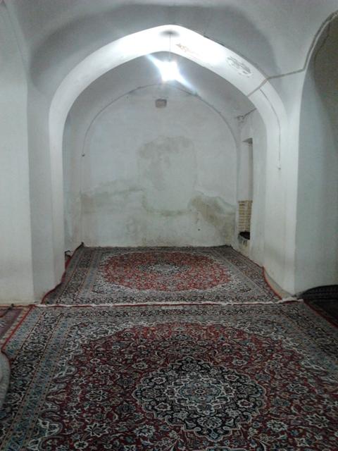برای رسیدن به شبستان تحتانی از دربی آهنی وارد یک هشتی میشویم که محل درآوردن کفش ها بوده و هست. دو پله پایین تر شبستان قرار دارد. به محض ورود، یک دیوار آجرچین را می بینیم که به هیچ وجه مناسبتی با معماری منحصر به فرد مسجد ندارد. بالای این دیوار آجرچین، قسمتی از یک محراب با قدمت بسیار را می توان مشاهده کرد.