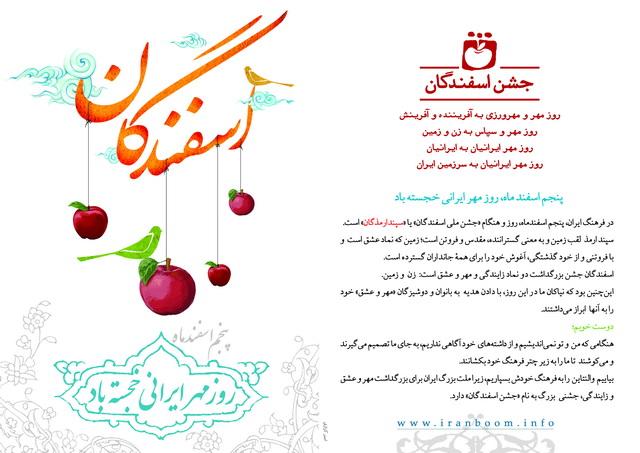 به مناسبت جشن ملی اسفندگان تارنمای ایرانبوم اقدام به چاپ پانزده هزار برگه شادباش نموده است. هدف تارنمای یاد شده پاسداشت آیینهای ایرانی و جلوگیری از اشاعه فرهنگ غربی است. امید است در این راه کامیاب باشد. کسانی که تمایل دارند در پاسداشت آیینهای ایرانی یاریرسان باشند و یا مجزا این برگهها را به چاپ برسانند، یک رایانامه به ایرانبوم ارسال نمایند.
