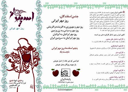به مناسبت جشن ملی اسفندگان روز مهر ایرانی، تارنمای ایرانبوم اقدام به چاپ بیست هزار برگه شادباش نموده است. هدف تارنمای یاد شده پاسداشت آیینهای ایرانی و جلوگیری از اشاعه فرهنگ غربی است. امید است در این راه کامیاب باشد. کسانی که تمایل دارند در پاسداشت آیینهای ایرانی یاریرسان باشند و یا مجزا این برگهها را به چاپ برسانند، یک رایانامه به ایرانبوم ارسال نمایند.
