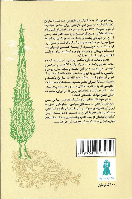 برای تهیۀ چکیده تاریخ تجزیه ایران و شش دفتر تاریخ تجزیه ایران به کتاب فروشی بلخ در نشانی تهران - بلوار کشاورز - روبه روی بوستان لاله - خیابان جلالیه - شماره ۱۲ - تلفن ۸۸۹۵۱۳۱۲ مراجعه فرمایید.