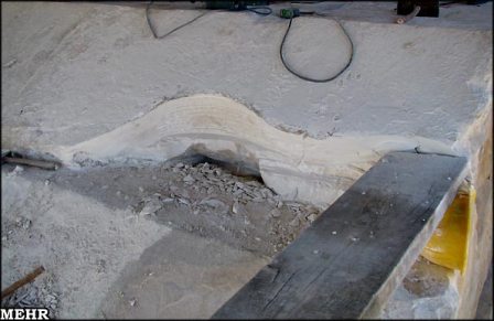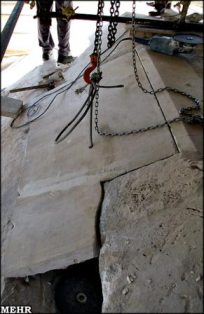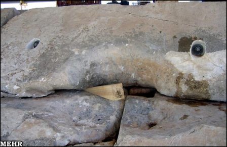 تصویری از نحوهی جابهجایی سنگهای سقف آرامگاه کورش که در آن بهکارگیری از شیوهها و ابزار ابتدایی و غیرحرفهای در جریان مرمت این اثر جهانی کاملاً مشخص است. چنان که در عکس ملاحظه میکنید نحوهی بهکارگیری اهرم فلزی برای جابهجایی سنگ موجب صدمه به سنگهای زیرین و خراش و خسارت آنها شده است. |