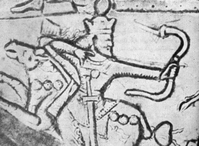 شاه در عنفوان شباب با همان وصفی که در کاسۀ سلیمان گفته شد بر تخت نشسته است. تزئینات لباس به نقش و نگار دیگری است. در اطراف شاه چهار نفر از بزرگان کشور در نهایت احترام ایستادهاند. تاج شبیه تاجی است که بر روس سکههاست و مخصوص این پادشاه است.