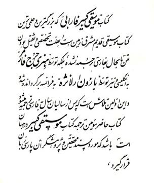 فارابی در پیشگفتار موسیقی کبیر در پاسخ به درخواست ابوجعفرمحمد ابن قاسم کرخی وزیر خلیفه عباسی برای نگارش کتابی در زمینه موسیقی چنین مینویسد:"از من خواستی در این باب (موسیقی)کتابی تالیف کنم...من چندی درنگ کردم کتابهایی که در این فن از قدما و متاخران به دست ما رسیده تامل نمودم و امید آن داشتم که در میان آنها آنچه خواسته تو را برآورده و ما را نیز از پرداختن کتابی تازه در موضوعی که پیش از این نگاشته شده بی نیاز کند،بیابم،اما دیدم که در این کتابها همه اجزای این صناعت مذکور نیست و در بسیاری از مطالب آنها خطا راه یافته و در بیان بیشتر مطالب موسیقی نظری سخنانی پیچیده گفته شده است ....دراین کار به راهی که خاص ماست رفته ایم و روش دیگران را با آن نیا میخته ایم."(37)