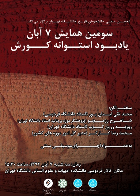 سومین همایش یادبود استوانه کورش بزرگ، در روز هفتم آبان ۱۳۹۲، توسط انجمن علمی دانشجویان تاریخ دانشگاه تهران در تالار فردوسی دانشکده ادبیات و علوم انسانی برگزار شد. این همایش با استقبال قابل توجه دانشجویان و علاقهمندان همراه بود و اساتید برجسته تاریخ و باستان شناسی به سخنرانی پرداختند. سخنرانان این همایش جناب آقای محمد رضا کارگر (مدیر کل امور موزه های کشور)، محمد تقی ایمان پور (استاد دانشگاه فردوسی)، روزبه زرین کوب (استاد دانشگاه تهران) و شاهرخ رزمجو (پژوهشگر موزه بریتانیا و استاد دانشگاه تهران) بودند.