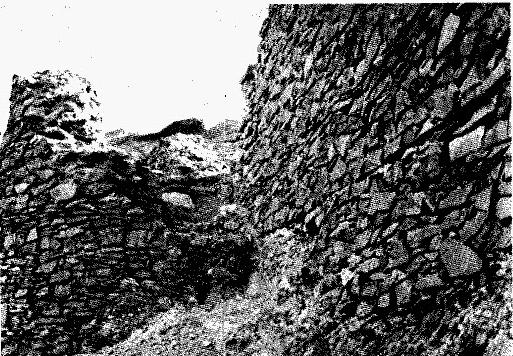 شکل 10 ـ درهی سمت جنوب قله قبه مانندی که قلعه دختر شوراب گناباد در روی آن ساخته شده است. در سمت چپ عکس قسمت شمال و بعضی قطعات منفرد که در شیب دره ساخته شده و در سمت راست دیوار و برج برآمدگی شرقی دیده میشود. در چپ و راست قعر دره بقایای دیوار و دروازهای که بمدخل سمت شرق راه میداده است نیز دیده میشود.