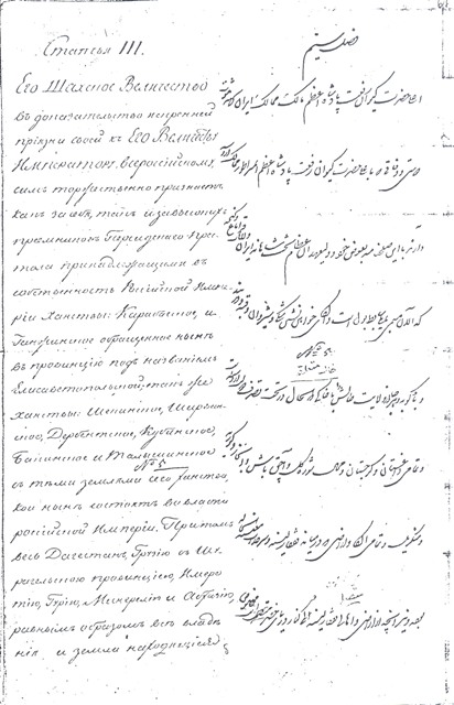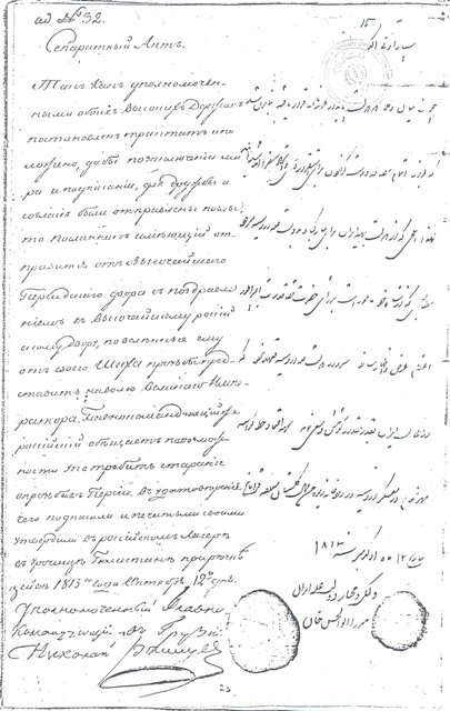 با تحمیل قرارداد گلستان به ایران، ولایتهای قراباغ و گنجه و اولکای خوانیننشین شکی و شیروان و قبه و دربند و بادکوبه و هر کجا از ولایت تالش که در اشغال روسیان بود، تمامی داغستان و گرجستان و محال شورهگل و آچوقباشی و گروزیه و منگریل و آبخاز و «تمامی اولکا و اراضی که در میانه قفقاز و سرحدات معینهالحالیه بود و نیز آنچه از اراضی و اهالی قفقاز الی کنار دریای خزر متصل است، مخصوص متعلق به ممالک ایمپریه روسیه میدانند».