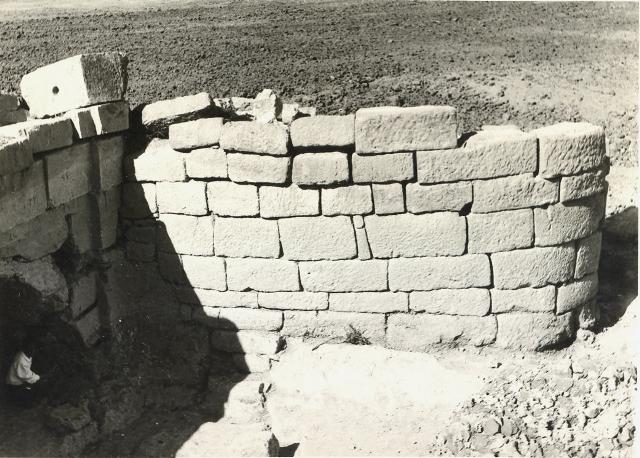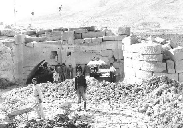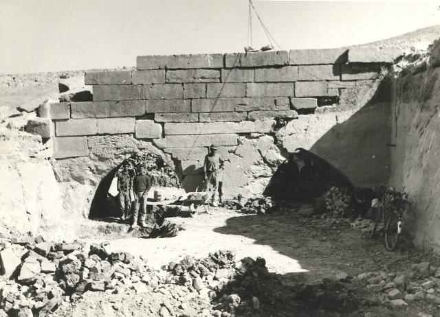 عکس شمارهٔ 2: در این عکس کارگران مشغول رسوبزدایی از پیرامون نمای باختری بند داریوش هستند. این عکس نشان میدهد که سنگهای نمای باختری پیش از وقوع سیلاب شمارهگذاری شده بوده است.