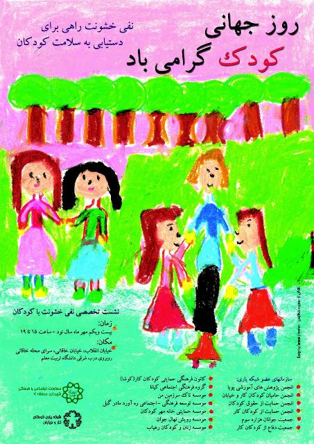 روز پنج شنبه 21 مهر با همکاری شبکه یاری و معاونت اجتماعی منطقه 7 شهرداری تهران نشست و کارگاه تخصص با عنوان نفی خشونت راهی برای دستیابی به سلامت کودکان با حضور استادان دانشگاه و متخصصین و مددکاران آسیبهای اجتماعی در سرای محله خاقانی واقع در خیابان انقلاب خیابان خاقانی روبروی درب شرقی دانشگاه تربیت معلم از ساعت 3 تا 7 بعد از ظهر برگزار میگردد.
