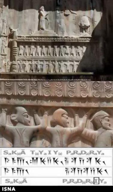 بنابرین مدرک تنها کتیبه نیست، بلکه نقوش برجسته آرامگاهها که جای پیکرها در هر کدام از آنها ثابت است، نیز مدرک مهمی بهشمار میرود. پیکر «سکای آن سوی دریا» هم در آرامگاه داریوش اول (سال 486 قبل از میلاد) و هم در آرامگاههای خشایارشا یکم (465 قبل از میلاد)، اردشیر اول (424 قبل از میلاد)، داریوش دوم (404 قبل از میلاد)، اردشیر دوم (358 قبل از میلاد) و اردشیر سوم (338 قبل از میلاد) پیوسته در جای بیست و چهار قرار دارد که دال بر آن است که در سال های 486-338 قبل از میلاد سرزمین «سکای آن سوی دریا» بخشی از امپراتوری هخامنشی بود.