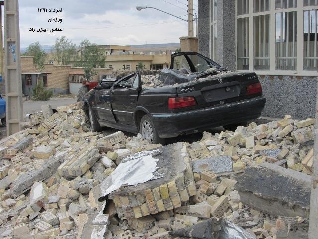 این عکس ماشینی را نشان میدهد که زیر بانک صادرات ورزقان پارک شده است، خود بانک هم بسیار آسیب دیده که هم اکنون پس از دو ماه در حال ترمیم و بازسازی است.
