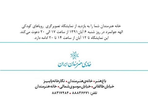 نگارخانهها، فضاهای هنری و تالارهای نمایشی خانهٔ هنرمندان ایران و تماشاخانهٔ ایرانشهر با برگزاری برنامههای مختلف به استقبال هشتمین ماه پاییز رفتند. از شنبه 6 آبانماه 1391 از ساعت 17 تا 20 نمایشگاه تصویرگری رویاهای کودکی الهه جوانمرد در خانهٔ هنرمندان ایران افتتاح میشود. این نمایشگاه تا 12 آبان از ساعت 14 تا 20 ادامه دارد.