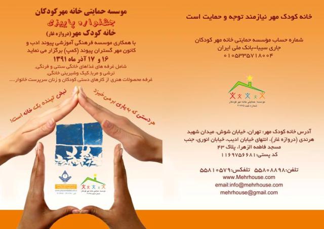 شانزدهم و هفدهم آذرماه 1391 بازارچهای به نفع کودکان بازمانده از تحصیل و محروم تحت پوشش خانه کودک مهر برگزار میشود.