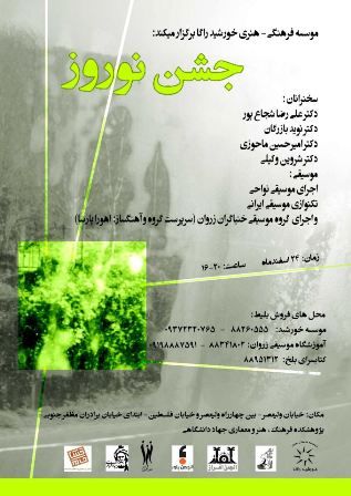 موسسه فرهنگی ـ هنری خورشید راگا با همکاری چند سازمان مردمنهاد جشنی را برای فرا رسیدن بهار برگزار میکند. در این برنامه که عصر روز پنجشنبه، بیستوچهارم اسفندماه 1391، در «پژوهشکده فرهنگ، هنر و معماری جهاد دانشگاهی» برگزار میشود استادان علیرضا شجاعپور، نوید بازرگان، امیرحسین ماحوزی و شروین وکیلی سخنرانی خواهند کرد. اجرای موسیقی نواحی، تکنوازی موسیقی ایرانی و اجرای گروه موسیقی «خنیاگران زروان»، به سرپرستی اهورا پارسا، از دیگر بخشهای جشن یادشده است. انجمن افراز، بنیاد فردوسی، انجمن باور و «انجمن دوستداران و حافظان خشت خام»، در کنار آموزشگاه موسیقی زروان و نشر شورآفرین، دیگر انجمنهای برگزارکننده همایش نوروز هستند.