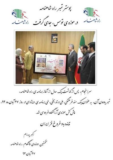 پس از گذشت یکسال از آغاز برنامهٔ راه شاهنامه، تمبر یادمان آن، به عنوان یک سند فرهنگی، ملی و تاریخی، طی برنامهٔ ویژهای در روز 27 آبانماه 1393، پیشکش موزهٔ آرامگاه حکیم ابوالقاسم فردوسی شد.