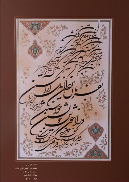 گفتنی است آثار خوشنویسی شکستهنستعلیق استاد شمسالدین مرادی، نیز از بارزترین نمونههای هنر فاخر ایرانی در روزگار ماست، ویژه آثاری که از آموزههای ادیبان بزرگ زبان پارسی همچون فردوسی، خیام و حافظ آفریدهاند. همچنین فعالیتها و کارنامه درخشان ایشان در طول سالهای متمادی در زمینه تالیف کتاب، برپایی نمایشگاهها و دریافت عنوانهای برتر جشنوارههای جهانی و بینالمللی، گواه این سخن است.