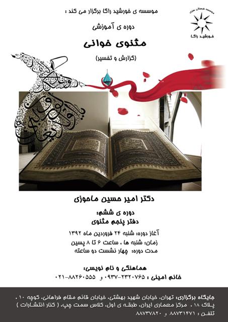 گام ششم دورهٔ آموزشی مثنوی خوانی توسط مؤسسهٔ خورشید راگا و به استادی دکتر امیرحسین ماحوزی برگزار میشود. گفتنی است این دوره شامل چهارنشست دو ساعته خواهد بود و نخستین نشستِ آن در تاریخ شنبه 24 فروردینماه 1392، از ساعت 18 تا 20، به نشانی : خیابان بهشتی، خیابان قائم مقام فراهانی، کوچه 10، پلاک 18، طبقهٔ اول، کلاس سمت چپ، تلفن : 88731471 ، برگزار خواهد شد.